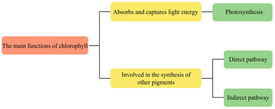 Chlorophyll acts as the central pigment of photosynthesis and drives the process of photosynthesis. During photosynthesis, chlorophyll accepts the energy and transfers it to other pigments, such as carotenoids and lutein. These pigments then pass the energy to reaction centers, which are crucial in converting carbon dioxide and water into organic matter through photosynthesis. Chlorophyll can also participate in the synthesis of other pigments. For example, in the synthesis of carotenoids, chlorophyll is involved as an intermediate in the process of their synthesis [19]. However, the mechanism of chlorophyll involvement in the synthesis of other pigments may vary for different species of microalgae. In Spirulina, there are two main pathways in which chlorophyll is involved in the synthesis of carotenoids: direct and indirect. The direct pathway refers to the fact that chlorophyll participates in its synthesis by binding directly to carotenoids; the porphyrin ring in the chlorophyll molecule can combine with a hydrocarbon chain in the carotenoid molecule to form the chlorophyll-carotenoid complex [20]. This complex can be further converted into other types of carotenoids, such as β-carotene and lutein. The indirect pathway refers to the synthesis of other intermediate products, such as fatty acids and cholesterol by chlorophyll, which are then involved in the synthesis of carotenoids. The chlorophyll a in Spirulina maxima can be involved in the regulation of lipogenesis pathway enzyme, and inhibit lipid accumulation [21]. The function role of chlorophylls is shown in Figure 3.