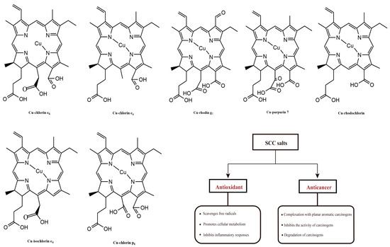 The antioxidant properties of chlorophylls have been investigated with the most common chlorophyll derivatives. Sodium copper chlorophyllin (SCC), due to the characteristics of no cyto/genotoxic properties toward human blood cells, can be produced from natural chlorophyll by solvent saponification reactions and copper incorporation (Figure 5). In addition to its attractive coloring properties, this group of chlorophyll derivatives consistently showed the highest antioxidant activity; and it was three to five times higher compared to chlorophyll derivatives not bound to copper [55]. Consistent results were obtained through in vitro analytical methods, including DPPH, ABTS, and the β-carotene test. These methods quantitatively determined the presence of free radicals, which caused the decolorization of β-carotene during the process of fatty acid oxidation [55,58,59]. Using the comet protocol, or biomarkers such as MDA, the oxidative protective effect of copper chlorophyll was demonstrated in cultured human blood cells [60]. Sato et al. investigated the antioxidant activity of SCC salts in rat hepatocytes, and found that thiobarbituric acid completely inhibited the production of reactive substances, and retarded lipid peroxidation. Similarly, SCC salt was able to reduce the formation of lipid hydroperoxides and avoid the activation of superoxide dismutase (SOD) against oxidative damage induced by methylene blue, ascorbic acid-Fe2+, and NADPH-ADP-Fe3+, even more effectively than other antioxidants, such as ascorbic acid, mannitol, and glutathione (GSH) [61].