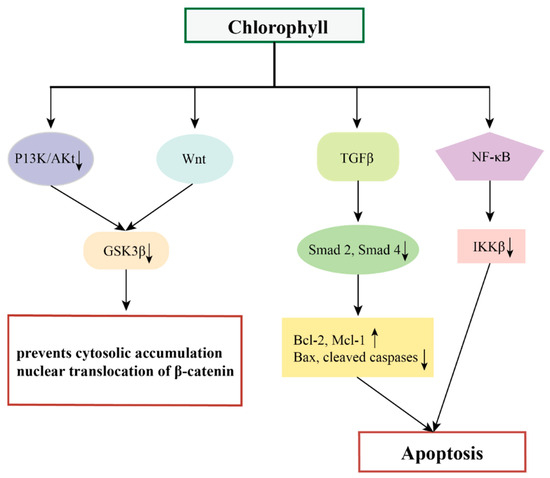 In addition, chlorophylls have chemopreventive effects on different tumors by targeting multiple oncogenic signaling pathways and transcription factors such as Wnt, NF-κB, TGFβ, and their downstream genes [85,86,87].