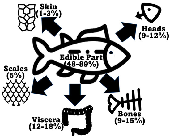 - Kumar, V.; Muzaddadi, A.; Mann, S.; Balakrishnan, R.; Bembem, K.; Kalnar, Y. Utilization of Fish Processing Waste: A Waste to Wealth Approach. In Emerging Post-Harvest Engineering and Techological Interventions for Enhancing Farmer’s Incom; ICAR-CIPHET: Ludhiana, India, 2022; pp. 127–131. [Google Scholar]