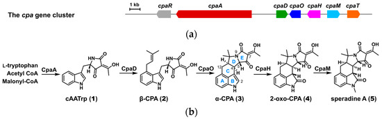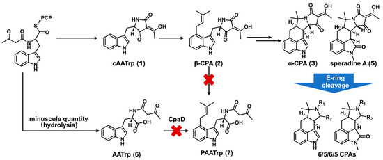 - Tokuoka, M.; Kikuchi, T.; Shinohara, Y.; Koyama, A.; Iio, S.-I.; Kubota, T.; Kobayashi, J.I.; Koyama, Y.; Totsuka, A.; Shindo, H.; et al. Cyclopiazonic acid biosynthesis gene cluster gene cpaM is required for speradine A biosynthesis. Biosci. Biotechnol. Biochem. 2015, 79, 2081–2085. [Google Scholar] [CrossRef] [PubMed]