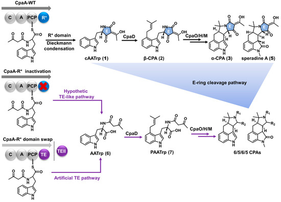- Liu, X.; Walsh, C.T. Cyclopiazonic Acid Biosynthesis in Aspergillus sp.: Characterization of a reductase-like R* domain in cyclopiazonate synthetase that forms and releases cyclo-acetoacetyl-L-tryptophan. Biochemistry 2009, 48, 8746–8757. [Google Scholar]