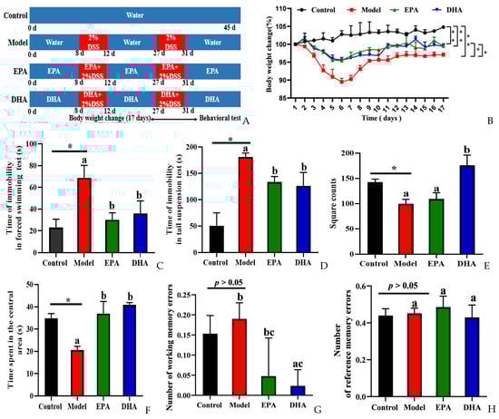 EPA and DHA alleviated DSS-induced depressive-like behavior of C57BL/6 mice. (A) Experimental design and timeline of DSS treatment. (B) The body weight changes were detected during the second DSS treatment and 12 days after DSS. (C,D) Time of immobility in the FST and TST. (E,F) The duration of time the mouse spent in the central area and the total number of grid crossings were recorded in the OFT. (G,H) Number of working memory errors and reference memory errors in EAM. * p < 0.05, ** p < 0.01 and different letters are used to indicate statistical differences.