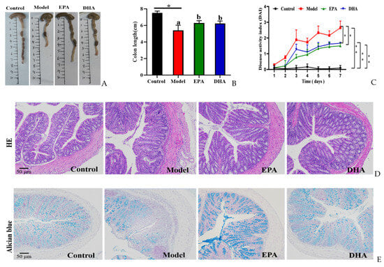 Compared to the mice of the control group, mice with two rounds of DSS treatment exhibited typical symptoms of colitis, such as reduced colon length (Figure 2A,B) and increased disease activity index (DAI) scores (Figure 2C). Dietary addition of DHA and EPA significantly alleviated the colitis phenotype by inhibiting the colon length shortening and avoiding the elevated DAI scores due to the changes of weight loss, loose stools, and hematochezia in mice. EPA and DHA exerted similar improvement in increasing the colon length and decreasing the DAI score (Figure 2A–C).