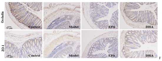 HE staining and Alician blue staining data displayed that an increased intestinal permeability was observed in the model group, such as intestinal structure atrophy (reduced villus height, Figure 2D), and low level acidic mucin level (Figure 2E). At the same time, immunohistochemical data revealed that the expression of tight junction proteins (TJs), including zonula occludens 1 (ZO-1) and occludin, were reduced in the colon of the model mice (Figure 2F). Moreover, long-term EPA/DHA supplementation significantly ameliorated intestinal barrier damage and maintained the integrity of the mechanical barrier of the intestinal mucosa by enhancing the protein expression of ZO-1 and occludin (Figure 2D–F).