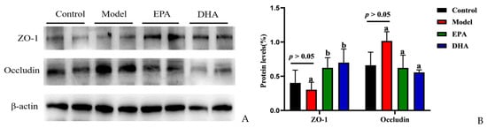 EPA and DHA ameliorated blood–brain barrier. (A) The protein expression of ZO-1 and occludin in the brain (B) The quantitative analysis of ZO-1 and occludin in the brain. Different letters are used to indicate statistical differences.