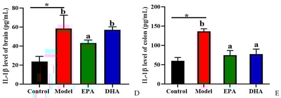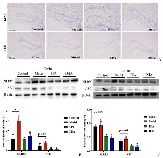EPA and DHA attenuated inflammation by regulating NLRP3 inflammasome. (A) Immunohistochemical representative diagram of activation markers of astrocyte and microglia (scale bar = 50 μm). (B,C) Key protein expressions of NLRP3 inflammasome and quantitative analysis of the brain and the colon. (D,E) IL-1β level of the brain and the colon detected by ELISA. * p < 0.05 and different letters are used to indicate statistical differences.