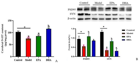 EPA and DHA promoted the expressions of synaptic proteins in the brain of DSS-administered mice. (A) Cerebral 5-HT level. (B) Representative immunoblots of synaptic proteins and the quantification. * p < 0.05 and different letters are used to indicate statistical differences.