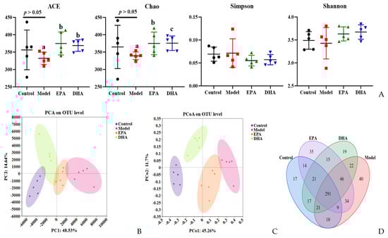 DSS intervention induced changes of the diversity and the structural composition of the intestinal flora (Figure 6A–G). As for the changes of flora diversity, DSS exposure decreased the ACE and Chao indexes, and dietary supplementation with DHA/EPA could equally inhibit these decreases (p < 0.05) and increase the α-diversity index (Figure 6A). However, the changes of the Simpson and Shannon indices among these four groups were not significant. Furthermore, in the PCA and PCoA plots, the control, model, EPA, and DHA groups showed different clustering of microbial community structure, and the gut microbial structure was changed after DSS, EPA, and DHA intervention (Figure 6B,C). In addition, 611 OTUs were identified in the fecal samples of all four groups as shown in the Venn diagram, of which 291 OTUs were common to all four groups, while 40 OTUs in the model group were different from all other groups (Figure 6D). However, the composition of microbial community structure showed different trends among the four groups (Figure 6E–G).