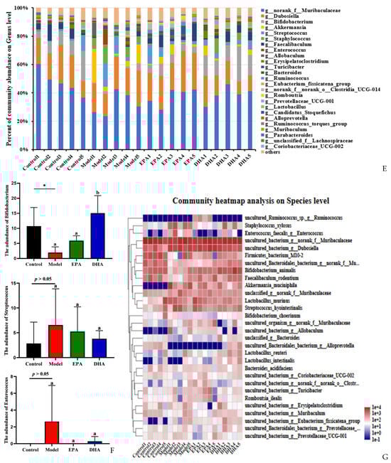 EPA and DHA improved the composition of microbial community structure. (A–C) Alpha diversity and beta diversity of gut microbiota. (D) Venn diagram. (E) Distribution of colony abundance at the genus level. (F) Changes in Bifidobacterium, Streptococcus, and Enterococcus at genus level. (G) Community heat map analysis on species level. * p < 0.05 and different letters are used to indicate statistical differences.