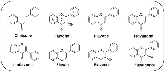Since the antifouling compounds used have proven to be harmful to the marine environment, the search for new more sustainable alternatives is urgent. One of these strategies can be the use of natural and nature-inspired compounds, namely flavonoids, which have shown interesting antifouling activity when tested against some biofouling marine organisms [8]. Flavonoids are natural polyphenols divided into several subclasses, including chalcones, flavonols, flavones, flavanones, isoflavones, flavans, flavanols, and flavanonols (Figure 1), which are not only commonly found in terrestrial plants, but also found in marine sources [9]. These compounds have been widely described over the last decades for having a wide range of biological properties, namely anticancer, antimicrobial, anti-inflammatory, antidiabetic, antioxidant, cardioprotective, and neuroprotective [9,10,11,12]. Despite the wide range of biological activities attributed to flavonoids over the last few decades, few studies reported their potential as antifoulants. To the best of our knowledge, the first paper reporting an antifouling assay using a flavonoid was carried out in 1989 [13]. Until now, 21 research papers described the antifouling potential of flavonoids obtained from marine and terrestrial sources, as well as synthetic ones, through the inhibition of the settlement of macrofouling species, namely mussels, barnacles, and algae, as well as their activity against microfouling organisms, including marine bacteria and diatoms. This article reviews, for the first time, the flavonoids with antifouling activity reported until now. The presentation of all flavonoids is organized by chemical class, and, within each chemical class, in chronological order of the year of the first report of their antifouling activity. The effect of flavonoids against the settlement/growth of some marine species involved in marine biofouling is presented, as well as the main structure–activity relationship (SAR) which is highlighted to support the design of new and optimized antifouling flavonoids.