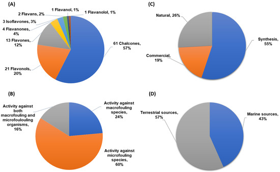 (A) Classes of flavonoids with antifouling activity reported in this review. (B) Bioactivity evaluated for antifouling flavonoids against macrofouler, microfouler, or both types of fouling organisms. (C) Basis of flavonoids studied for antifouling activity. (D) Source of natural flavonoids.