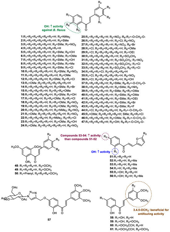 A total of 61 chalcones with antifouling potential have been reported. Although this class of flavonoids is common in nature, all chalcones reported to have antifouling activity were obtained by chemical synthesis. The structures of chalcones with antifouling potential are shown in Figure 3.