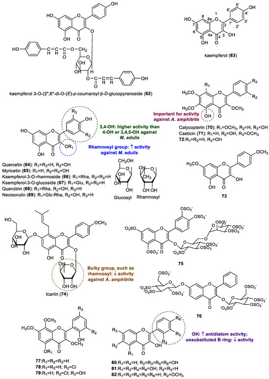Several flavonol aglycones, including kaempferol (63), quercetin (64), myricetin (65), and glycosides, such as kaempferol 3-O-rhamnoside (66), kaempferol 3-O-glucoside (67), quercitrin (68), neoisorutin (69), as well as kaempferol 3-O-(2″,6″-di-O-(E)-p-coumaroyl-β-d-glucopyranoside (62), previously reported by Yamashita et al. [13], were tested by Singh and collaborators for their antifouling potential against the settlement of blue mussel M. edulis, and their activity was compared with the standard antifouling compound copper sulfate [23]. Although these flavonols were obtained commercially for this study, these compounds are found in nature, namely in terrestrial and marine sources, and are associated with a wide range of biological activities [9,24,25,26,27]. Flavonoid 62 presented the highest activity in this study, with a more than twofold higher activity than the positive control copper sulfate. On the other hand, the other flavonoids presented only moderate activity, with 5% to 20% of the activity of copper sulfate. By comparing the activity of the tested flavonols, it appeared that flavonoid glycosides with a rhamnosyl moiety were more active than analogues with glycosyl moiety, and the presence of two hydroxy groups on the B ring allied to the two hydroxy groups on the A ring appeared to enhance the anti-settlement activity [23].