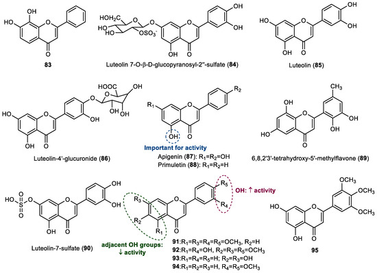 Besides the evaluation of flavonols 71 and 77–82 against diatoms C. socialis, N. leavissima, and N. parva, Haider et al. also studied the activity of the flavones luteolin (85) and flavones 91–94 against these biofouling organisms [32]. Luteolin (85) was the most promising flavone in this study, being active against all strains of diatoms tested (N. leavissima: EC50 = 30.39 μM, 8.70 µg/mL; C. socialis: EC50 = 21.59 μM, 6.18 µg/mL; and N. parva: EC50 = 27.15 μM, 7.77 µg/mL), whereas flavones 91–92 were active against N. leavissima (91: EC50 of 26.52 µM, 9.08 µg/mL; 92: 58.32 µM, 20.08 µg/mL) and C. socialis (91: EC50 of 10.75 µM, 3.68 µg/mL; 92: 25.15 µM, 8.66 µg/mL). Compound 93 was only active for C. socialis (EC50 57.15 µM, 14.53 µg/mL), while compound 94 only showed activity against N. leavissima (EC50 of 55.19 µM, 15.58 µg/mL) [32]. The presence of hydroxy groups on the B ring seems to be favorable for antidiatom activity, as well as the substituents on the A ring, but the presence of adjacent hydroxy groups on the A ring is not beneficial.