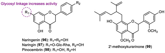 Naringenin (96), as well as the flavanones naringin (97) (obtained commercially) and pinocembrin (98) (isolated from Eucalyptus signata), were evaluated against the settlement of blue mussel M. edulis by Singh et al. and the activity was compared with the standard antifouling copper sulfate [23]. In comparison with positive control, compounds 96, 97 and 98 presented lower activity, having 11%, 24%, and 25% of the activity of the positive control copper sulfate, respectively. Naringin 97 showed to be more active than naringenin 96, inferring the importance of glycosyl linkage for this activity [23].