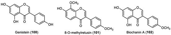 In addition to the evaluation of seven flavonols (Section 2.2), one flavone (Section 2.3) and three flavanones (Section 2.4), Singh and collaborators also tested the activity of isoflavone genistein (100) against the settlement of blue mussel M. edulis. This compound was found to display activity in the inhibition of the settlement of mussels, with 9% of the activity of the positive control copper sulfate, having a similar activity compared to the other flavonoids tested in the same study [23].