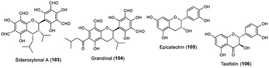 Sideroxylonal A (103), a flavan isolated from the leaves of Eucalyptus grandis by Singh et al., showed high repellent activity against blue mussel M. edulis at a concentration of 0.032 µmol/cm2 [42]. Another flavan, grandinal (104), isolated from the methanolic extract of the leaves of E. grandis by the same research group, also showed anti-settlement activity against the blue mussel M. edulis, comparable with the standard antifouling copper sulfate at the same concentrations tested [43]. Interestingly, the weaker activity of grandinal (104) compared with sideroxylonal A (103) may be due to the presence of tautomeric forms of grandinal. Grandinal was also found to exert some antibacterial activity against Staphylococcus aureus and B. subtilis, with an MIC of 50 and 100 µg/mL, respectively, which leads us to infer the dual activity of this molecule against both macrofouling and microfouling species [43].