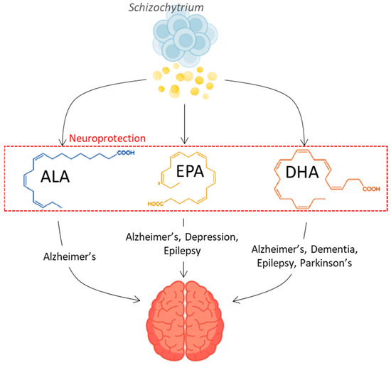 Neuroprotective potential effect of Omega-3 fatty acids derived from oleaginous organisms. ALA: α-Linolenic acid; EPA: Eicosapentaenoic acid; DHA: Docosahexaenoic acid (created with BioRender.com (accessed on 20 November 2023); Freevector [19,20]).