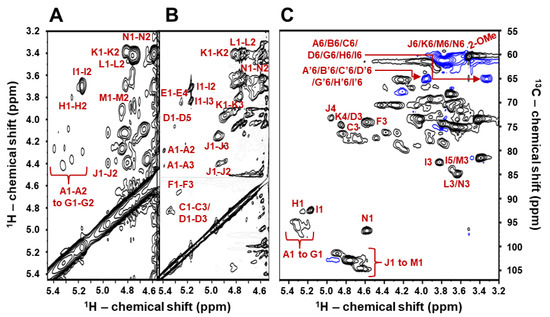 Structural determination of the composing Gal units in BoSG Fr1 was achieved by a combination of multiple 2D NMR spectra including 1H/1H COSY for assessment of short-range carbon-bonded vicinal/geminal 1Hs (Figure 2A), 1H/1H TOCSY for assessment of long-range carbon-bonded 1H spin systems (Figure 2B), and 1H/13C-edited HSQC for assessment of proton–carbon pairs (Figure 2C). For illustrative purposes, only the anomeric 1H region of the COSY and TOCSY spectra are depicted in Figure 2A,B. After proper assignments of all 1H chemical shifts (δH) of all Gal units using COSY and TOCSY spectra, the 13C chemical shifts (δC) were assigned using the HSQC spectrum, and full 1H and 13C chemical shift assignments were obtained for all Gal units of the native BoSG Fr1 (Table 1). A system of letters (from A to N) followed by numbers (from 1 to 6) was used to assign and label, in the 2D NMR spectra, all the δH and δC within the hexose rings of the distinct Gal units in BoSG Fr1 (Figure 2, and Table 1). Comparison between the δH and δC values from BoSG Fr1 with reference values from the literature [31,32,33,34] (Table 1), and the typical downfield δH shift of ~0.6 ppm, and downfield δC shift of ~6 ppm of sulfation (bold values) and glycosylation (italic values) sites have enabled us to identify the sulfation patterns and glycosidic bonds in the Gal units of BoSG Fr1. Typical δH and δC values of other ring positions have assisted us in identifying the presence of other chemical modifications such as the 3,6-anhydro Gal moiety in the α-AnGal units as well as the presence of methylation.
