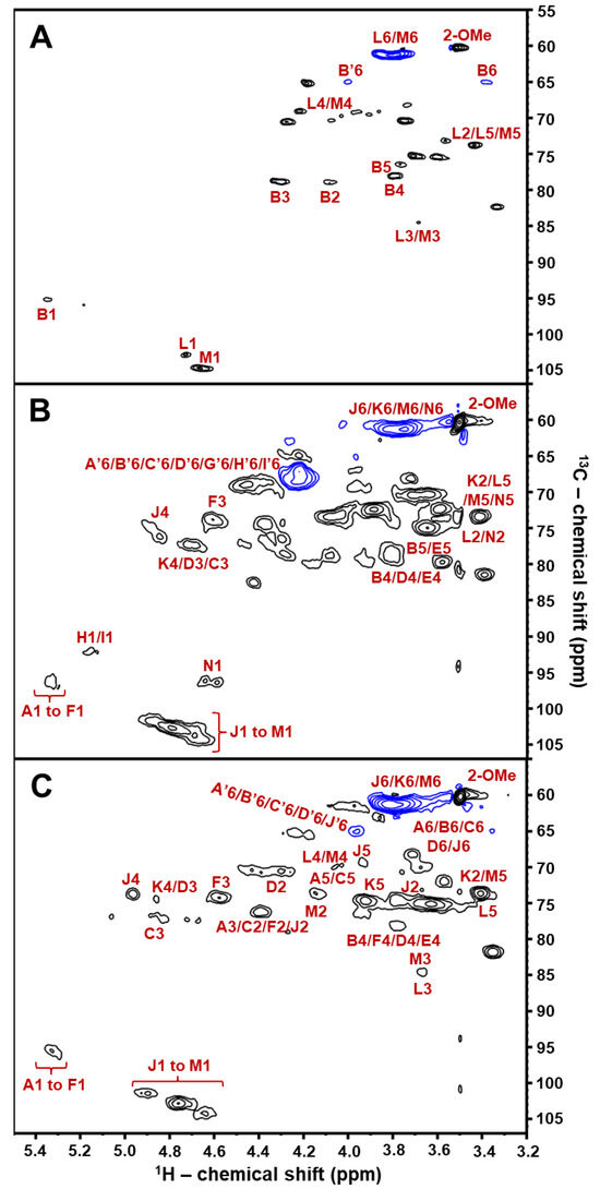 2D 1H/13C HSQC NMR spectra (δH/δC expansions 5.5–3.2/107.0–55.0 ppm) of the three chemically modified BoSG Fr1 derivatives studied in this work: (A) desulfated, (B) oversulfated, and (C) alkali-treated AnGal-enriched derivatives with key 1H/13C cross-peaks properly assigned. All 2D NMR spectra were recorded in D2O at 50 °C on a 500 MHz Bruker NMR instrument. The peaks with blue contours represent the negative phase of the CH2 groups, whereas the peaks with black contours represent the positive phase of the CH and CH3 groups.