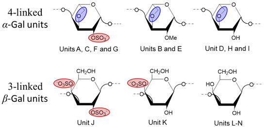 Structural representation of the BoSG Fr1 units identified by NMR analyses. The backbone of BoSG Fr1 is composed of both 4-linked α-Gal and 3-linked β-Gal units along with a variety of chemical modifications including sulfation at different levels and positions, presence of 3,6-anhydro moiety (AnGal), and methylation at the 2-O position. Sulfation esters are presented by red ellipses, while the 3,6-anhydro moiety is highlighted with blue ellipses. The letters used in the NMR assignments are indicated in the structures.