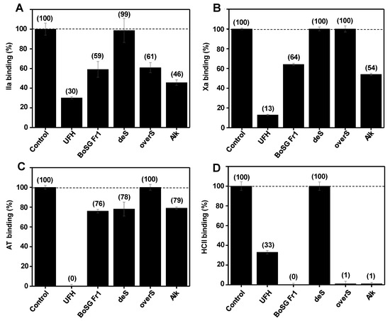 Solution SPR-based analyses were performed in a competitive fashion using a heparin surface (sensor chip) as previously reported [12]. In this study, the quality of interactions between the four BoSG Fr-1-derived samples used in our NMR-based analyses, native, desulfated (deS), oversulfated (overS), and alkali-treated (Alk) and the four main binding blood co-factors, IIa, Xa, AT, and HCII, were measured in terms of the binding inhibitory percentage of each co-factor alone (Figure 5). The standard mammalian glycosaminoglycan of high anticoagulant activity, UFH, was used in each assay as a positive control. Native BoSG Fr1 showed weaker binding inhibition of IIa (40% BoSG Fr1 vs. 70% UFH) (Figure 5A), Xa (35% BoSG Fr1 vs. 85% UFH) (Figure 5B), and AT (25% BoSG Fr1 vs. 100% UFH) (Figure 5C) than UFH, but stronger binding inhibition of HCII than UFH (100% BoSG Fr1 vs. 65% UFH) (Figure 5D). Taking into consideration a comparative analysis of the binding inhibitory property of BoSG Fr1 to the four blood co-factors against the heparin sensor chip, the following order of binding preference could be observed: HCII > IIa = Xa >> AT. This observation proves the preference of BoSG Fr1 for HCII and the weaker binding property of UFH to HCII as compared to BoSG Fr1. The necessity to use a higher concentration of HCII (800 nM) for interaction with the heparin surface during the SPR assay corroborates the fact that HCII does not bind to the heparin (sensor chip) as strongly as the other co-factors.