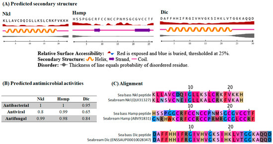 In silico analysis of the AMPs. (A) Secondary structures predicted for NK-lysin (Nkl), hepcidin (Hamp), and dicentracin (Dic) synthetic peptides by NetSurf P. (B) Antimicrobial activities predicted for Nkl, Hamp, and Dic synthetic peptides by AMPpred software. (C) Alignment between European sea bass synthetic peptides and gilthead seabream orthologues performed by Clustal Omega software and represented with Jalview.