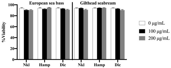 Viability of European sea bass or gilthead seabream head-kidney cells incubated with 0 (white bars), 100 (black bars), or 200 (grey bars) µg/mL of NK-lysin (Nkl), hepcidin (Hamp), or dicentracin (Dic) synthetic peptides for 6 h. Data represent the mean ± standard error of the mean (SEM) (n = 8).