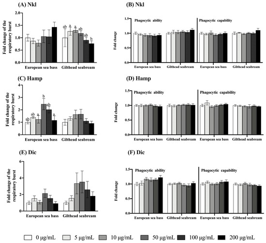 Respiratory burst (A,C,E) and phagocytic ability and capability (B,D,F) of European seabass or gilthead seabream head-kidney cells stimulated with 0, 5, 10, 50, 100, and 200 μg/mL of NK-lysin (Nkl), hepcidin (Hamp), and dicentracin (Dic) peptides for 6 h. Data represent the mean ± standard error of the mean (SEM) (n = 8). Different letters denote statistically significant differences among experimental concentrations by one-way ANOVA followed by a Tukey post hoc test (p < 0.05).