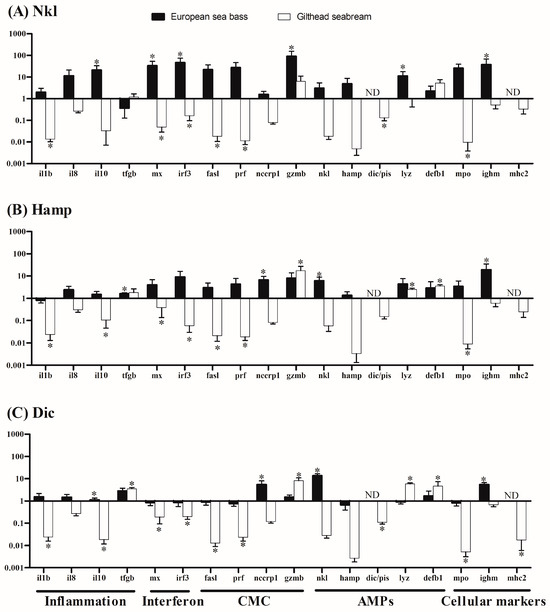 Gene expression of European sea bass or gilthead seabream head-kidney cells incubated with 50 μg/mL of NK-lysin (Nkl: A), hepcidin (Hamp: B), and dicentracin (Dic: C) synthetic peptides for 6 h. Data represent the mean ± standard error of the mean (SEM) (n = 6) of the fold change with respect to the control (0 μg/mL). Asterisks denote statistically significant differences between control and AMPs according to a Student’s t-test (p < 0.05). ND, non-detected.