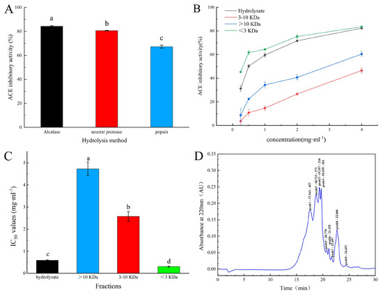 ACE inhibitor activity and molecular weight distribution of ultrafiltration hydrolysates: (A) ACE inhibitory activity assay of different proteases hydrolysates; (B) the ACE-inhibiting activity of the ultrafiltration fractions was assessed at various levels of concentration; (C) IC50 values for ACE inhibitory activity of the ultrafiltration fractions; (D) determination of molecular weight distribution of SCGH using gel permeation chromatography (TSK G2000 gel chromatography columns). Different lowercase letters (a–d) on the bars mean that the difference is significant (p < 0.05).