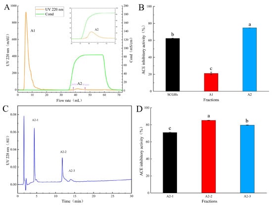 Purification, column separation, and enzyme adsorption of peptides: (A) ACE–Sepharose 4B column affinity adsorption plot; (B) ACE inhibitory activity of different affinity adsorption components; (C) RP-HPLC separation of the targeted affinity eluent (C18 column); (D) ACE inhibitory activity of the purified component by RP-HPLC. Different lowercase letters (a–c) on the bars mean that the difference is significant (p < 0.05).