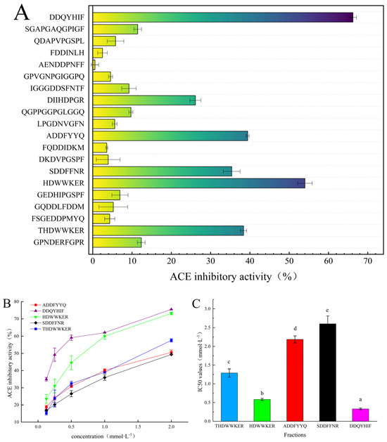 We synthesized the 20 peptides screened for based on the procedure in Section 2.2 and evaluated their ACE inhibition activities at a concentration of 1 mmol·mL−1 (Figure 3A). Among them, DDQYHIF displayed the highest inhibitory activity (66.2 ± 0.9%), followed by HDWWKER (54.0 ± 1.8%), THDWWKER, ADDFYYQ, and SDDFFNR. The effects of different concentrations of the above peptides on IC50 were examined. DDQYHIF also exhibited good ACE inhibition, with an IC50 value of 333.5 ± 25.3 μmol·L−1, followed by HDWWKER, with an IC50 value of 583.6 ± 27.6 μmol·L−1, consistent with the results in Figure 3A showing the magnitude of ACE inhibitory activity (Figure 3B). It is important to highlight that the octapeptide THDWWKER, which elongates the heptapeptide HDWWKER by adding one threonine at the N-terminus, demonstrated diminished inhibitory activity, indicated by an IC50 value of 1291.8 ± 107.6 mmol·L−1 (Figure 3C).