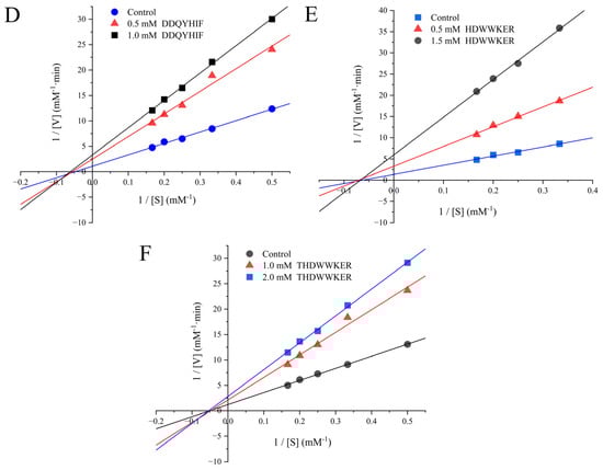 The inhibition kinetics of DDQYHIF, HDWWKER, and THDWWKER were analyzed using Lineweaver–Burk plots according to the protocol described by Lin et al. (2017) [44]. The mixture for the DDQYHIF reaction consisted of 100 μL HHL (3, 4, 5, and 6 mmol·L−1) as substrate, 50 μL of 5 mmol·L−1ACE, and 100 μL of the sample solution (0.1, 0.5, and 1 mmol·L−1 DDQYHIF). The mixture of HDWWKER and THDWWKER reactions consisted of 100 μL of HHL (2, 3, 4, 5, and 6 mmol·L−1) as substrate, 50 μL of 5 mmolL −1 ACE, and 100 μL of sample solution (0.1, 0.5, and 1.5 mmol·L−1 HDEEKER; 0.2, 1, and 2 mmol·L−1 THDWWKER). Inhibition was determined under the same conditions as in Section 3.3. Lineweaver–Burk plots were plotted as the reciprocal of the initial reaction rate (1/V) versus substrate concentration (1/[S]), and Km and Vmax were calculated.