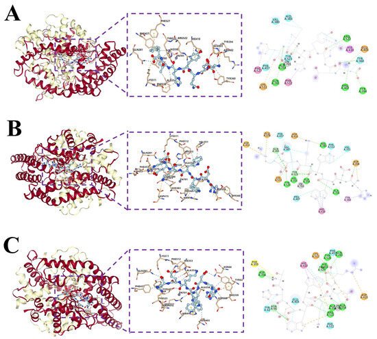 The 3D and 2D plots of molecular docking of peptides with ACE: (A) the ACE–DDQYHIF complex; (B) the ACE–HDWWKER complex; (C) the ACE–THDWWKER complex. The chart displays different interactions: salt bridge forces (indicated by the orange dotted line), hydrogen bond forces (indicated by the dashed blue line), hydrophobic interaction forces (indicated by the gray dashed line), π–π stacking forces (indicated by the green dashed line), zinc ion forces (indicated by the purple dashed line), and π–cation interactions (indicated by the yellow dashed lines). In the protonation of the receptor, histidine is protonated under different pH conditions and is HID when the hydrogen atom is at the δ-position nitrogen atom and HIE at the ε-position nitrogen atom, i.e., His513, His353, His383, His387, and His410 are transformed to Hie513, Hie353, Hid383, Hid387, and Hie410.