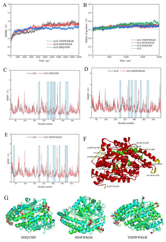 Molecular dynamics (MD) simulation: (A) RMSD curve of ACE–peptide complex system; (B) Rg curve of ACE–peptide complex system; (C) RMSF curve of ACE–DDQYHIF complex system; (D) RMSF curve of ACE–HDWWKER complex system; (E) RMSF curve of ACE–THDWWKER complex system; (F) ACE protein 3D map; (G) diagram of conformational differences between ACE–peptide complex systems and protein monomers. Different color cartoons in the figure represent different systems: the green cartoon is the ACE monomer protein, the blue cartoon is the ACE–peptide complex system, and the arrow points from the ACE monomer protein to the ACE–peptide complex system. The length of the arrow indicates the size of the difference between the two systems.
