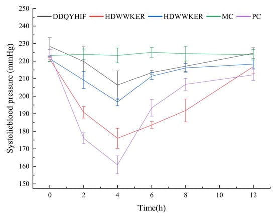 The spontaneously hypertensive rat (SHR) is a widely used animal model for studying human essential hypertension [17]. After the intravenous administration of THDWWKER, HDWWKER, and DDQIHIF, antihypertensive effects were evaluated in SHRs. As shown in Figure 6, HDWWKER had good effects on lowering blood pressure. A significant reduction in SBP was observed between 2 and 8 h (p < 0.05), with the lowest SBP of 176 mmHg occurring around 4 h after HDWWKER was administered. The SBP then recovered to 220 mmHg after 12 h.