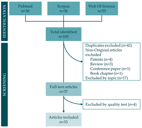 Following a literature search in the major online databases PubMed, Scopus, and Web of Science, a total of 105 articles were identified (36 from PubMed, 36 from Scopus, and 33 from Web of Science) based on the search equations described in the Materials and Methods section. Subsequent to the identification process, 42 duplicate publications were discerned and excluded from consideration. Furthermore, nine non-original articles, consisting of four patents, three reviews, one conference paper, and one book chapter, were omitted from the dataset. Additionally, 17 publications were excluded by topic and inclusion and exclusion criteria. Finally, a total of 37 full-text articles underwent rigorous quality tests, leading to the exclusion of 4 articles that failed to meet the predefined score threshold. As a result, the articles included in this systematic review comprise 33 publications. The workflow diagram of the search process is presented in Figure 1.