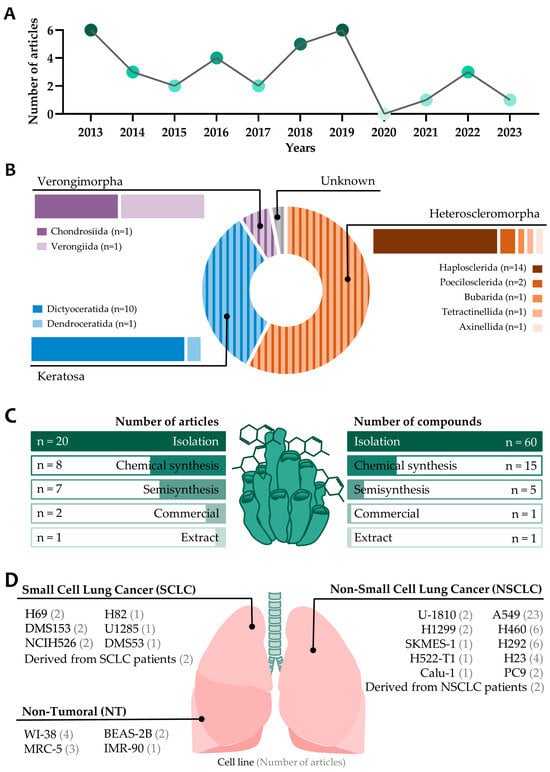 Figure 2. Graphical representation of the main characteristics of articles included in this systematic review. (A) Number of articles published per year (2013–2023) included for analysis in this systematic review. (B) Taxonomic categorization into subclass and order is performed for marine sponges serving as sources of compounds and extracts or as inspiration for synthesis. The number of articles is indicated in parentheses. (C) Graphical representation of the method for obtaining compounds included in this systematic review, quantifying the number of articles and compounds associated with each methodology. (D) Number of publications in which each cell line is used and its classification.