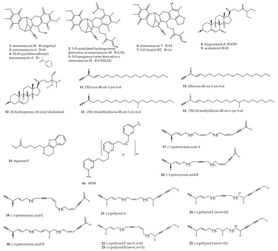 26. Mejia, E.J.; Magranet, L.B.; De Voogd, N.J.; Tendyke, K.; Qiu, D.; Shen, Y.Y.; Zhou, Z.; Crews, P. Structures and Cytotoxic Evaluation of New and Known Acyclic Ene-Ynes from an American Samoa Petrosia sp. Sponge. J. Nat. Prod. 2013, 76, 425–432. [Google Scholar] [CrossRef] [PubMed]