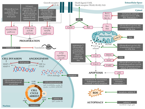Sponges are sessile invertebrates that lack an innate immune system or physical defensive structures, such as spines or shells. Consequently, their primary mode of protection lies in the synthesis of secondary metabolites, serving as a self-defense mechanism that facilitates adaptation to their environment. Furthermore, the great biodiversity observed among sponge phyla contributes to the production of a diverse array of molecules with different chemical characteristics [9]. Approximately 30% of identified MNPs are sourced from sponges, exhibiting potential anticancer effects. These compounds encompass alkaloids, sterols, terpenoids, macrolides, polyketones, peptides, glycosides, and quinones [8]. The anticancer properties may be explained by the ability to regulate certain cellular and molecular processes, such as modulation of the cell cycle, apoptosis, and inflammation [9].