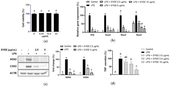 The RAW 264.7 macrophage cells were purchased from Korean Cell Line Bank (Seoul, Republic of Korea). They were cultured in DMEM supplemented with 10% fetal bovine serum (FBS) and 1% penicillin–streptomycin at 37 °C in a 5% CO2 humidified atmosphere. For experimental procedures, cells were pretreated with SYEE or its fractions for a duration of 6 h, followed by stimulation 100 ng/mL LPS for indicated period of time.