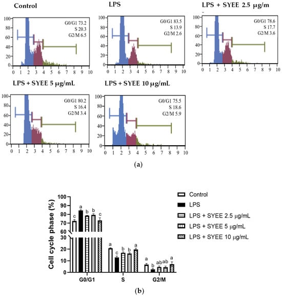 29]. In our study, LPS treatment induced cell cycle arrest primarily in the G0/G1 phase while concurrently reducing the proportion of cells in the S and G2/M phases, indicating that LPS-induced inflammation led to cell cycle arrest in the G0/G1 phase. SYEE mitigated this LPS-induced cell cycle arrest in the G0/G1 phase, suggesting a potential role in counteracting the disruption of the cell cycle induced by LPS-mediated inflammation.