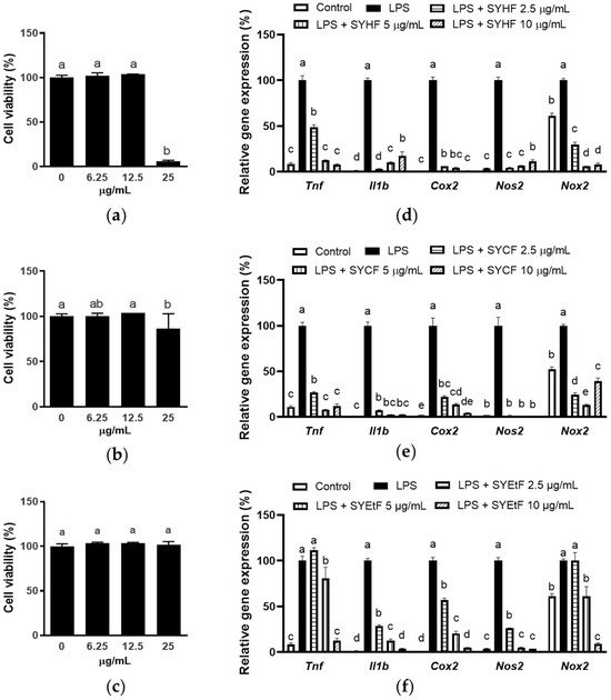 The robust inhibition of SYCF and SYHF on the LPS-induced upregulation of proinflammatory genes was observed at concentrations as low as 2.5 µg/mL. This observation strongly supports the anti-inflammatory properties of SYHF and SYCF, indicating that LLE is an effective method for concentrating bioactive compounds with potent anti-inflammatory properties from SYEE. It is worth noting that while LLE can enhance the efficiency of extracting bioactive components, such as phenolic compounds and meroterpenoids from algae, it is important to consider the toxicity associated with the use of chloroform as a solvent.