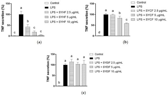 SYEE and fraction samples were dissolved in DMSO for treatment. RAW 264.7 macrophages were pretreated with SYEE and fraction samples in FBS-free medium for 6 h, followed by simulation with 100 ng/mL of LPS for 24 h. The conditioned media were collected, and their TNF levels were quantified using an enzyme-linked immunosorbent assay employing a TNF mouse uncoated ELISA kit (Thermo Fisher Scientific) in accordance with the manufacturer’s instruction.