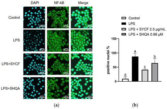 5 cells/well one day prior to treatment. On the following day, the cells were pretreated with SYCF or SHQA for 6 h, followed by treatment with 100 ng/mL LPS for 2 h. Cells were rinsed with ice-cold PBS. This was followed by a fixation step involving incubation in chilled 100% methanol for 5 min. Subsequently, cells underwent a triple wash with PBS to eliminate any residual fixative. For permeabilization, cells were treated with 0.1% Triton X-100 for 10 min. Blocking of non-specific binding sites was achieved by incubating the cells in a solution of 1% bovine serum albumin (BSA) and 22.52 mg/mL glycine in PBS containing 0.1% Tween 20 (PBST) for 30 min. Cells were then exposed to the primary antibody, diluted in 1% BSA in PBST, and incubated for 1 h at room temperature. Following three PBS washes to remove unbound primary antibody, cells were incubated with a secondary antibody conjugated with Alexa Fluor 488 in PBST for 1 h in a dark environment to prevent photobleaching. Imaging of the stained cells was performed using an FV3000 confocal microscope (Olympus Life Science, Tokyo, Japan), capturing detailed cellular structures and localization of the target proteins.