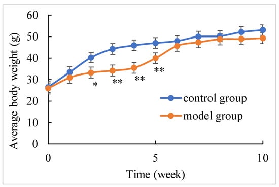 Body weight of control and chronic shellfish poisoning model mice at ten weeks. (* p < 0.05, ** p < 0.01).