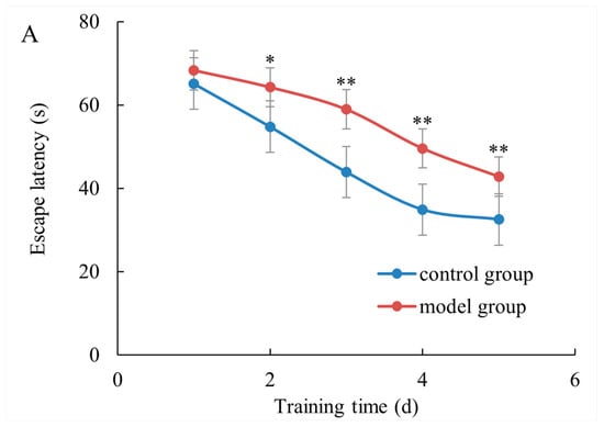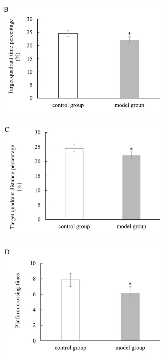 Experiments commenced on the first day of administration in the last week, and a place navigation test (PNT) was conducted on each group of mice for a total of 5 days. As the training duration increased, both groups exhibited a gradual reduction in the average escape latency period (Figure 2A). The spatial learning ability of mice in each group was improved during the 5-day training period. Compared to the control group, the model group showed significantly longer probe time (p < 0.05). During the trial phase, after removing the platform, we recorded the frequency with which mice crossed over to where it had been located (Figure 2B–D). We assessed whether there were differences in training time between different doses of PST exposure by recording search time within correct quadrants. Model mice took considerably longer to find the target quadrant, crossed the platform less frequently, and spent less time in the correct quadrant than that in control mice (p < 0.05). Taken together, our data suggested that PSTs impaired the cognitive performance of mice.