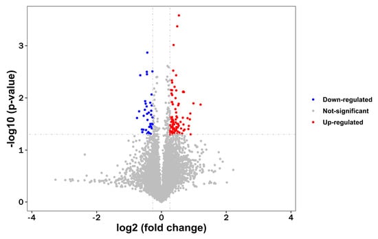Volcano plot of differentially expressed proteins between control and shellfish poisoning model groups. Volcano plot of ratios and p-value representing protein abundance changes between control and model groups. Proteins with p < 0.05 and above/below 1.2-fold changes are identified as proteins with significant changes. Down-regulated, p < 0.05 (blue dots); up-regulated, p < 0.05 (red dots).